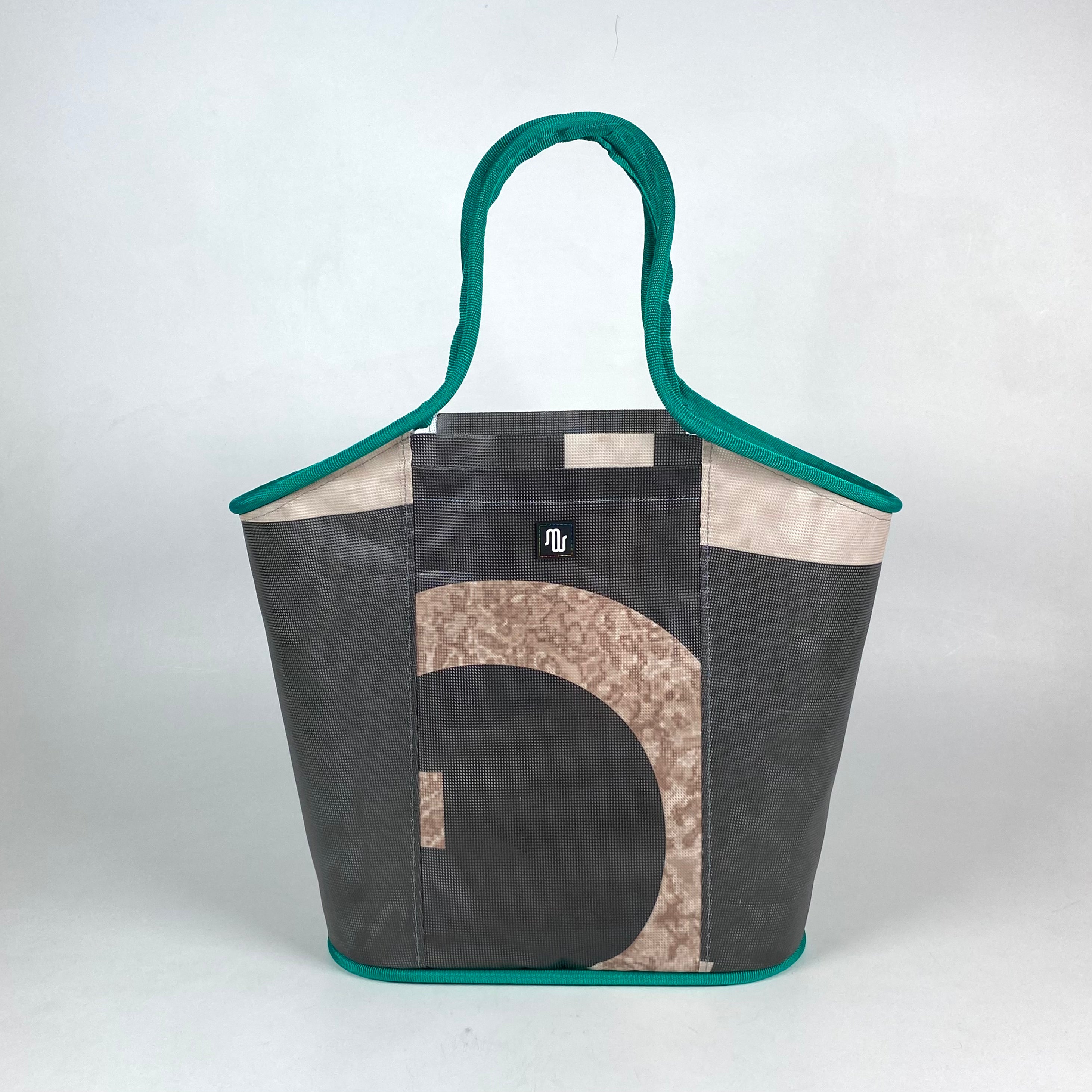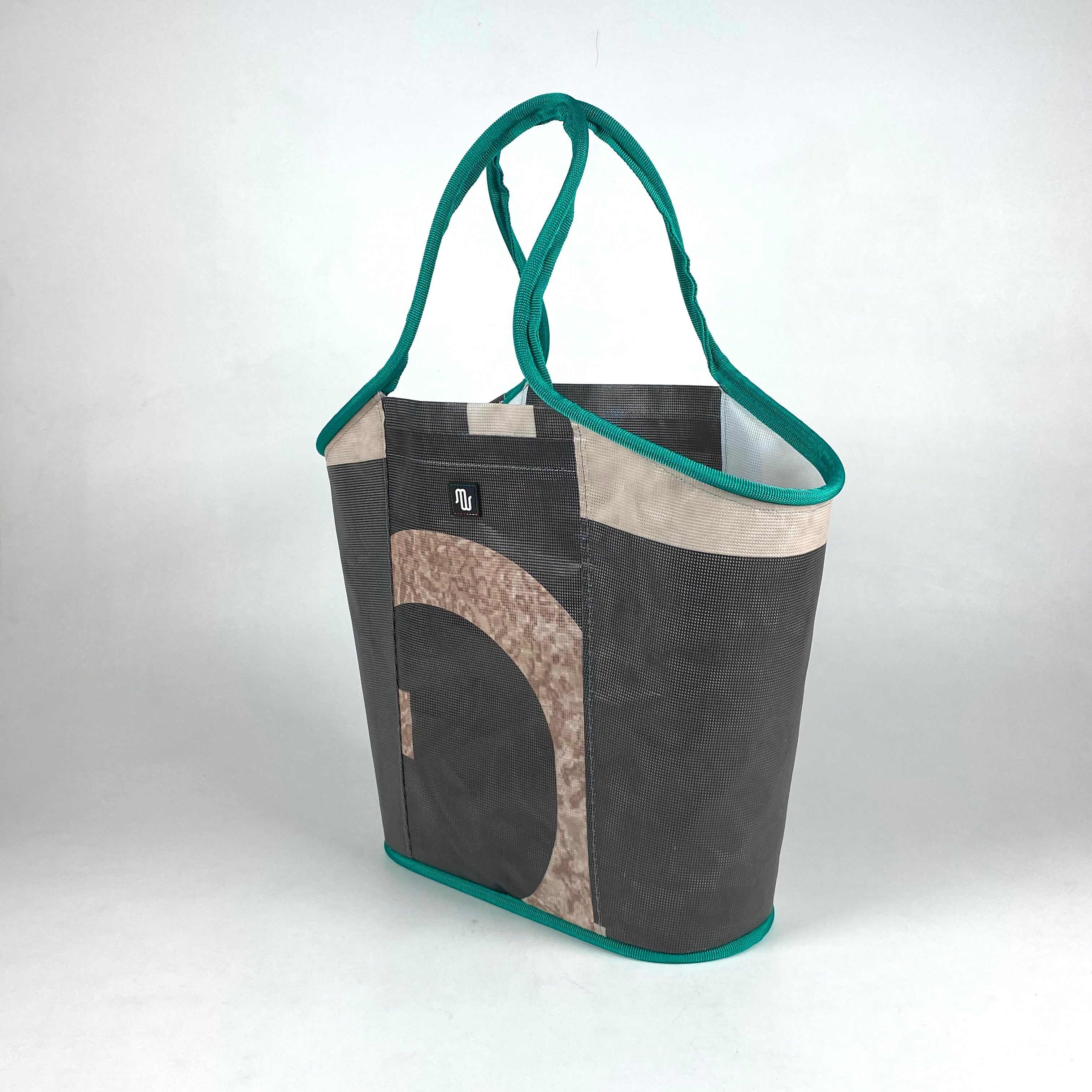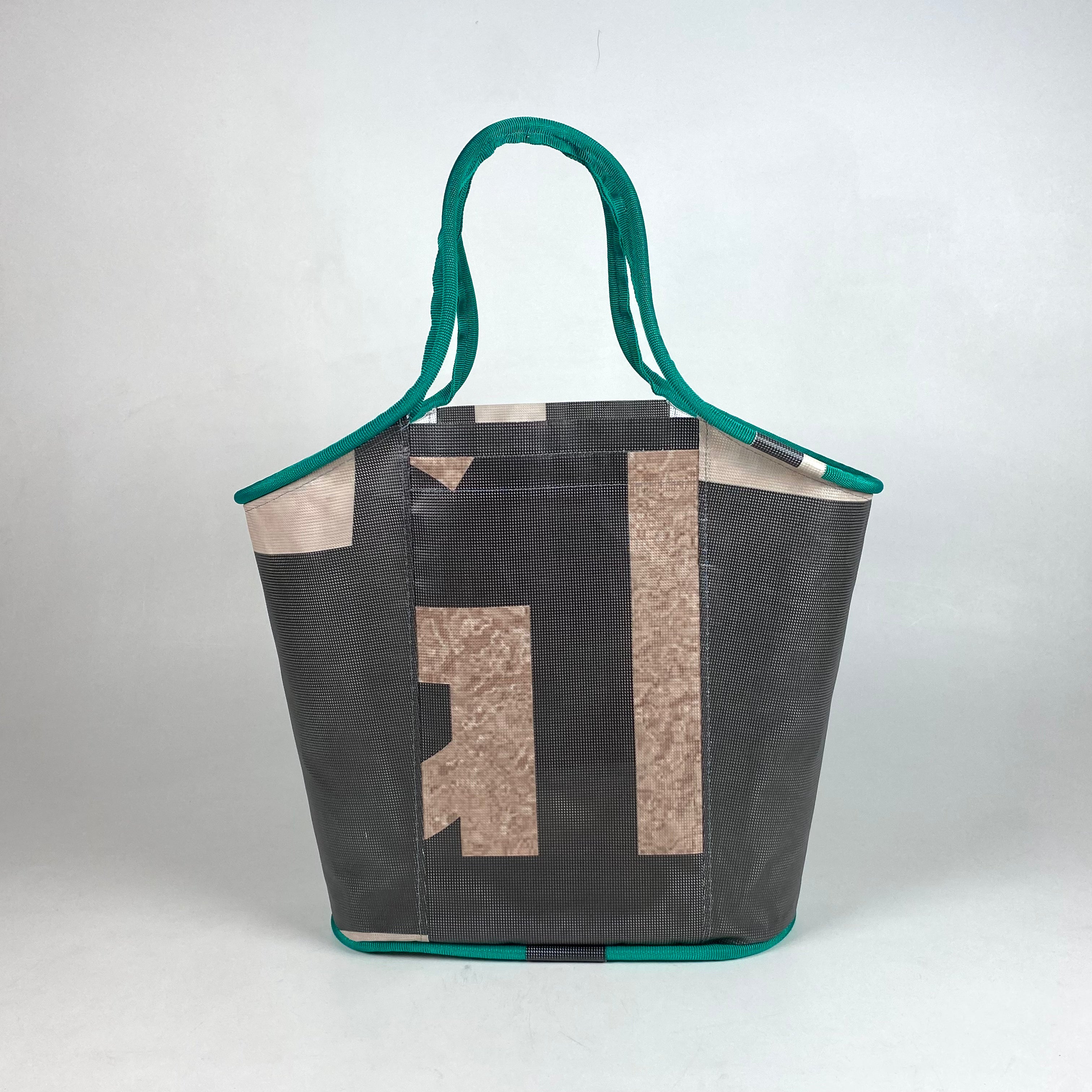 It is composed of repurposed mesh material that was formerly used as advertising banners on buildings. You may learn about how these types of bags are made here.
