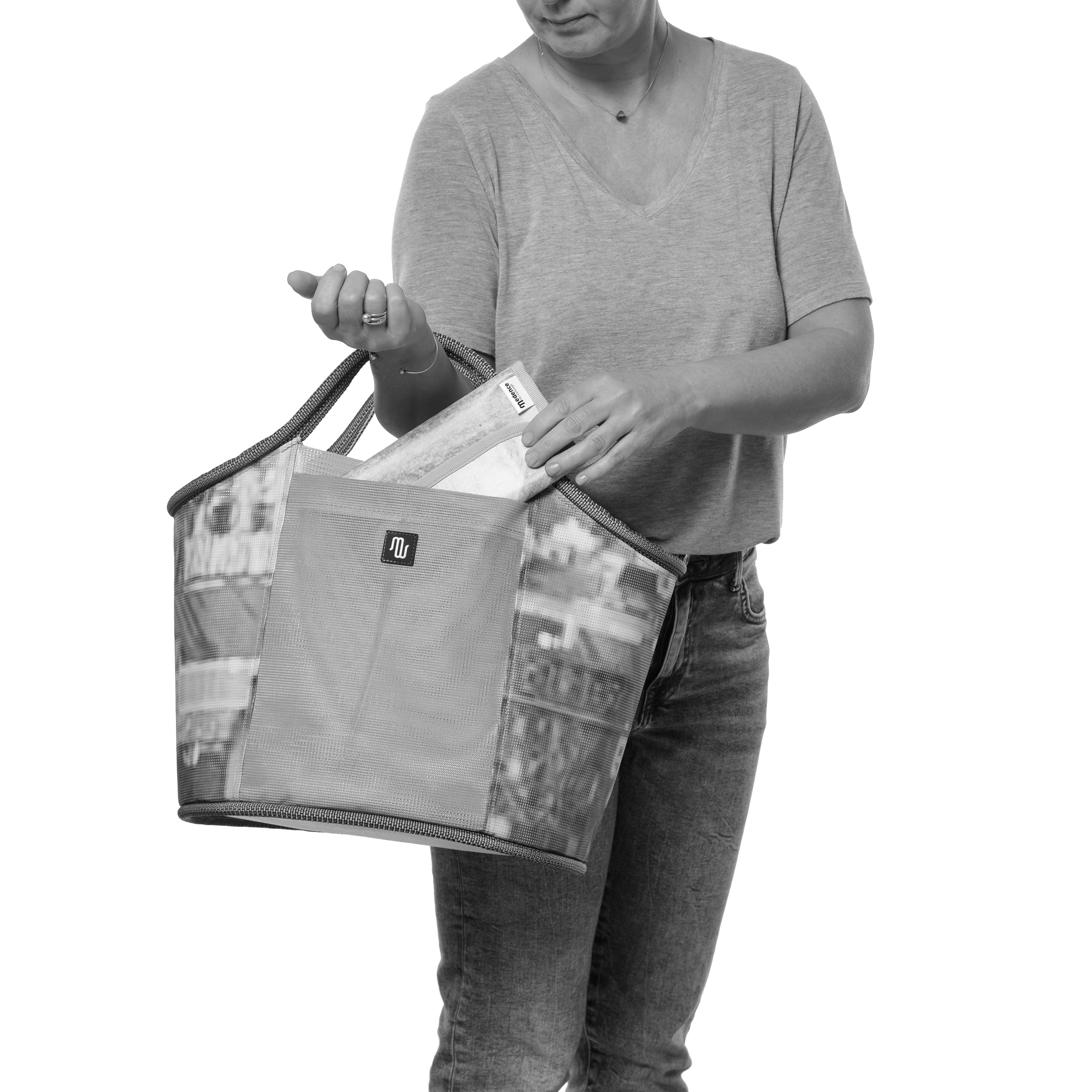 Ez a modern bevásárlókosár újrahasznosított épülethálóból készült. A PIAC és az EXPO kosár kombinációja. Keskenyebb aljjal rendelkezik, de rövidebb fogóval. Mindkét oldalára raktunk egy-egy zsebet is, hogy kényelmesen elférjenek benne az olyan apróságok, mint a bevásárló lista, pénztárca, kulcs.